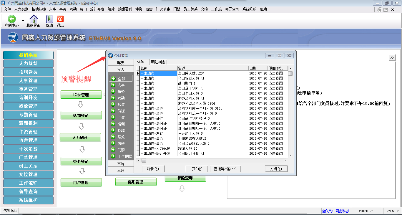 如上所示,用户一登录系统,即弹出预警提醒与人文关怀结合的信息,如当天总人数,当天报到人数,当天辞工到期人员,当天生日人数,当天入职纪念日人数以及未签劳动合同人数、未投保人数,合同证件到期人数等,预警提醒信息可以依据客户需求自定义,双击即可查找或导出明细,一目了然。