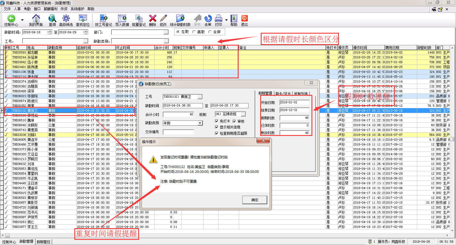 2、在请假控制方面,可以根据员工的请假时长设定不同的颜色进行区分,同时针对于不同的请假类别以及重复的请假输入进行控制,做到防呆提醒功能,以减少HR管理者请假事务性工作的出错率。