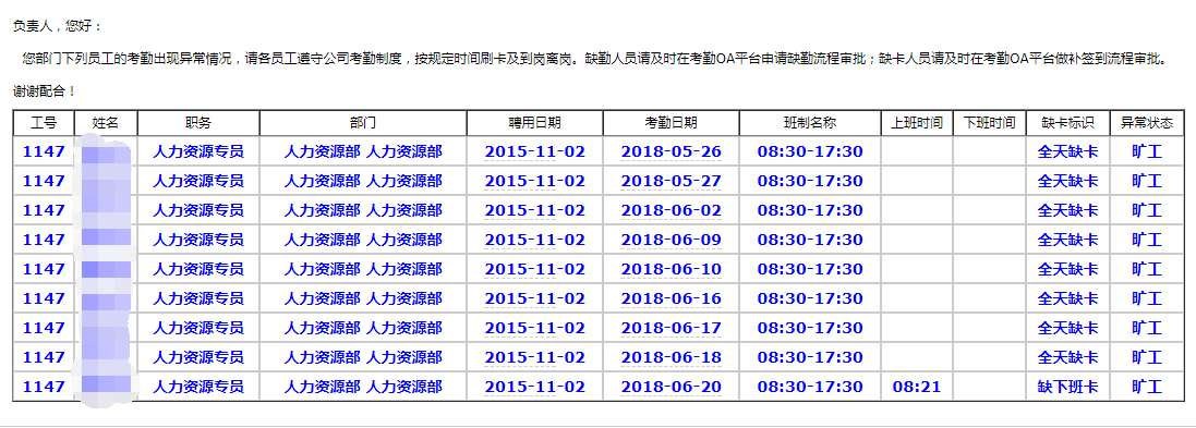 4、考勤异常下发通知、回馈不及时,沟通难度大。